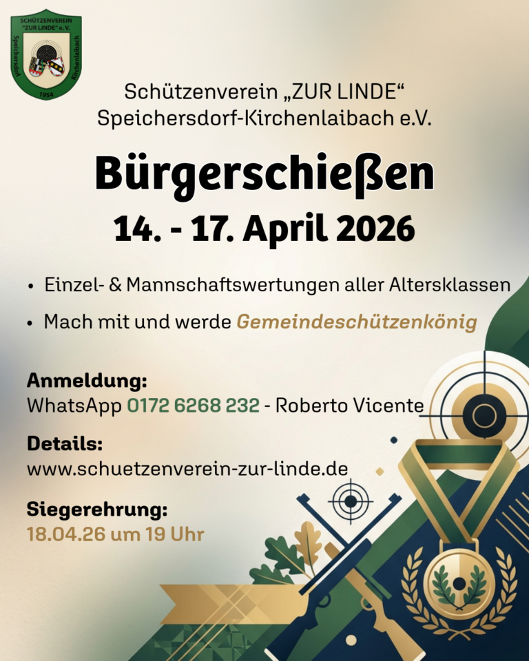 Wir laden alle Bürgerinnen und Bürger der Gemeinde Speichersdorf herzlich zu unserem Bürgerschießen 2026 ein!